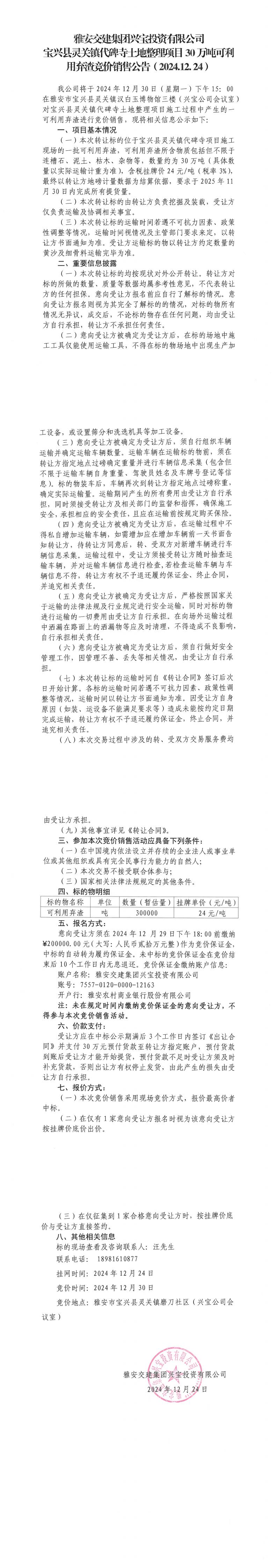 雅安交建集團(tuán)興寶投資有限公司靈關(guān)鎮(zhèn)代碑寺土地整理項(xiàng)目30萬噸可利用棄渣競價(jià)銷售公告(2024.12.24)