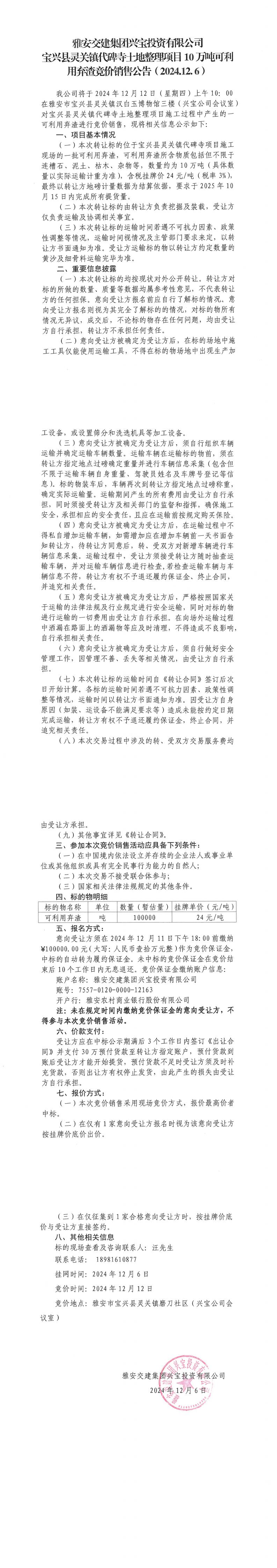 雅安交建集團(tuán)興寶投資有限公司靈關(guān)鎮(zhèn)代碑寺土地整理項(xiàng)目10萬噸可利用棄渣競價銷售公告(2024.12.06)
