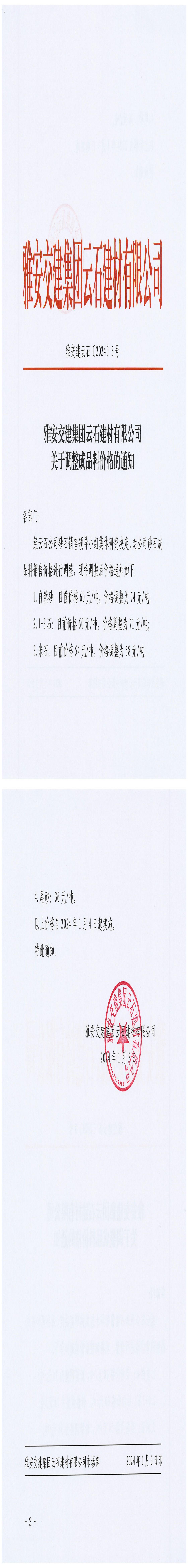 雅安交建集團云石建材有限公司成品料價格調整公告(2024-01-04)