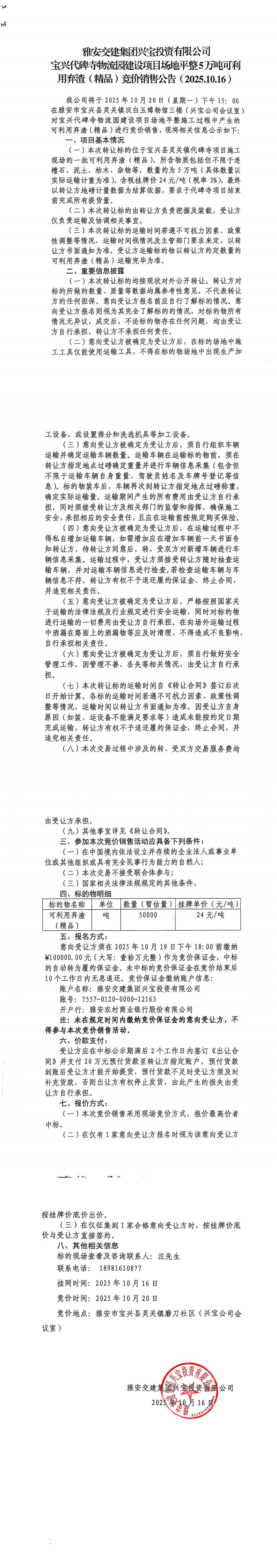 雅安交建集團興寶投資有限公司寶興代碑寺物流園建設項目場地平整5萬噸可利用棄渣(精品)競價銷售公告(2025.10.16)