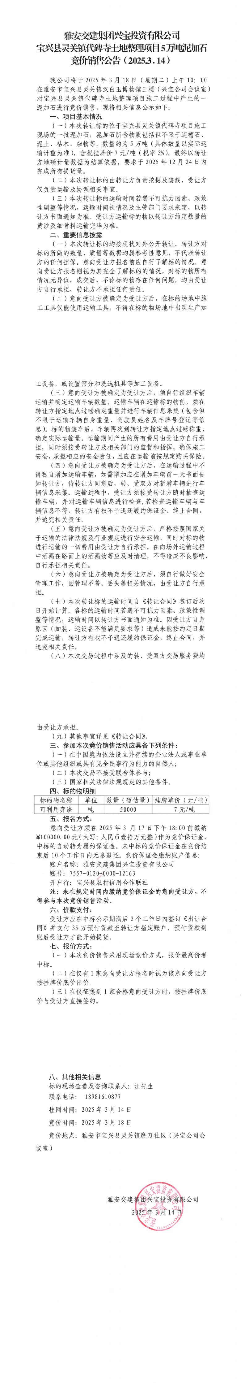 雅安交建集團(tuán)興寶投資有限公司寶興縣靈關(guān)鎮(zhèn)代碑寺土地整理項目5萬噸泥加石競價銷售公告(2025.03.14)