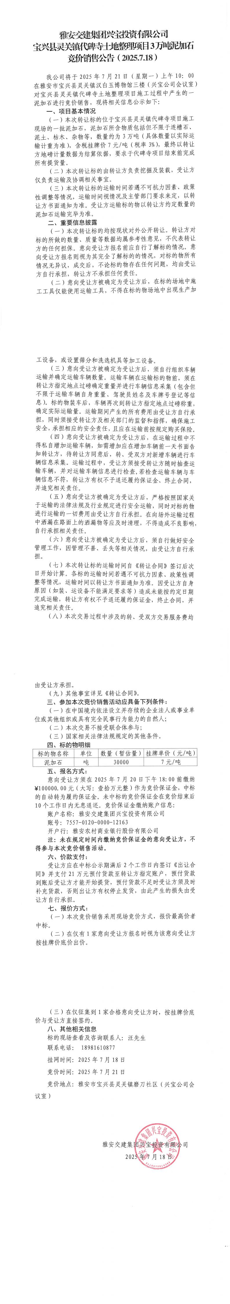 雅安交建集團興寶投資有限公司3萬噸泥加石競價銷售掛網公告
